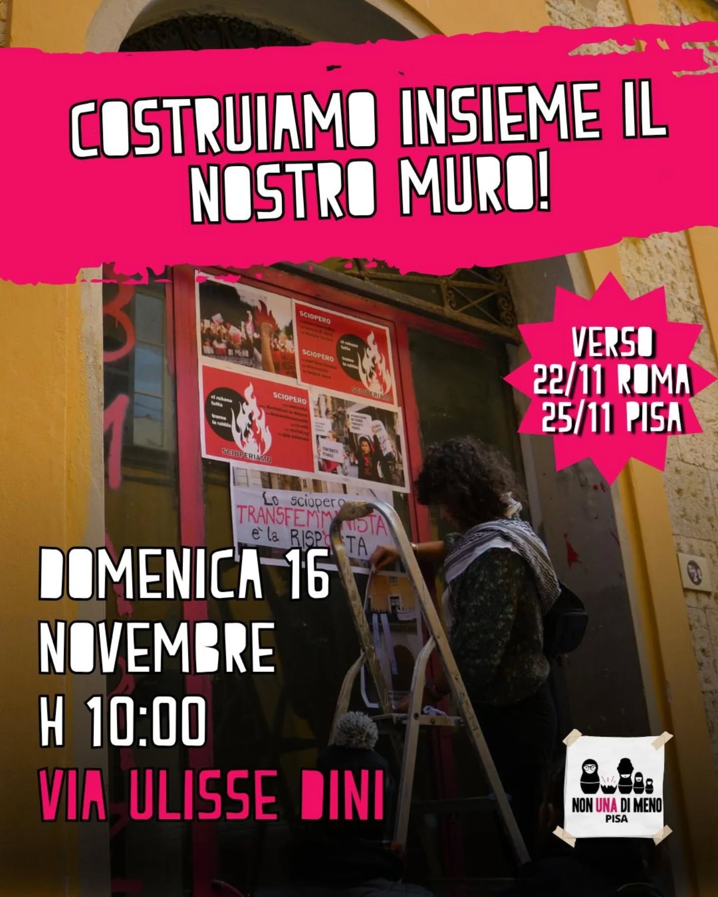 Ci troviamo domenica 16 Novembre alle ore 10 in via Ulisse Dini, vicino piazza dei Cavalieri per dare nuovamente vita al muro di non una di meno, un muro permanente in cui imprimere le parole e le immagini che accompagnano le nostre lotte! Porta il tuo contribuito per costruire insieme una città con muri transfemministi.